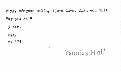 //// Flyg, sångens milda, ljuva duva, flyg och till //// "Djupan dal" //// 9 str. //// mel. s. 104 //// Yseniu$:Haf/ ////