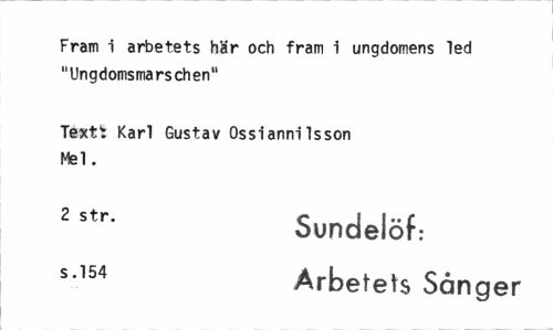 //// Fram i arbetets h'är och fram i ungdomens led "Ungdomsmarschen" //// Textt Karl Gustav Ossiannilsson Mel. //// 2 str" Sundelöf: //// s-'54 Arbetets Sånger ////
