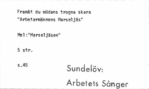 //// Framåt du mödans trogna skara "Arbetarmännens Marsel jäs" //// Mel:"Marseljäsen" //// 5 str. //// s'45 Sundelöv: //// Arbetets Scmqer ////