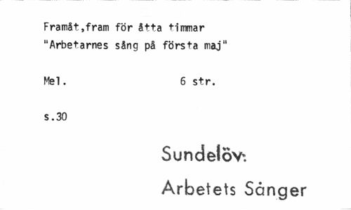 //// Framåt,fram för åtta timmar "Arbetarnes sång på första maj" //// Mel. 6 str. //// s .30 //// Sundelov. Arbetets Sånger ////