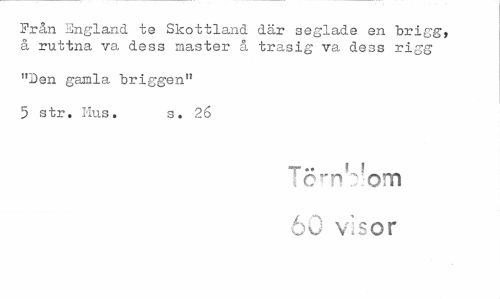 //// Från England te Skottland där seglade en brigg, å ruttna va dess master å trasig va dess rigg //// "Den gamla briggen" //// 5 str. Mus. s. 26 //// T" « ! //// ! cm: om //// 60 visor ////
