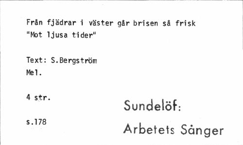 //// Från fjädrar i väster går brisen så frisk "Mot ljusa tider" //// Text: S.Bergström Mel. //// Sundelöf: Arbetets Sånger ////
