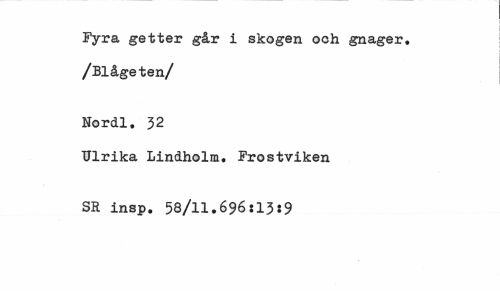 //// Fyra getter går i skogen och gnager. /Blågeten/ //// Nordl. 32 //// Ulrika Lindholm. Frostviken SR insp. 58/11.696i13:9 ////