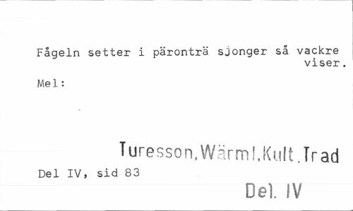 //// Fågeln setter i päronträ sjonger så vackre //// viser. //// Mel: //// Turesson,Wärmt,Kult.Trad //// Del IV, sid 83 //// Del IV ////