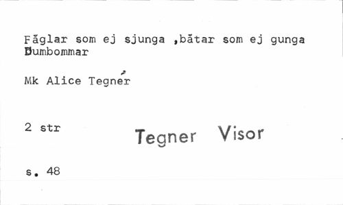//// Fåglar som ej sjunga »båtar som ej gunga Bumbommar //// * //// Mk Alice Tegner //// 2 8tr Teaner Visor //// x> //// s. 48 ////