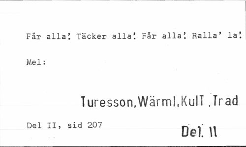 //// Får alla'. Täcker alla! Får alla'. Ralla' la'. Mel: //// Turesson,Wärml.KulT .Trad //// Del II, sid 207 _ v lt //// Del. U ////