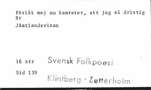 //// Förlåt mej nu kamrater, att jag så dristig är //// Jämtlandsvisan //// 15 str Svensk folkpoesi //// Sid 139 //// Klintberg ~Zetterho(m ////