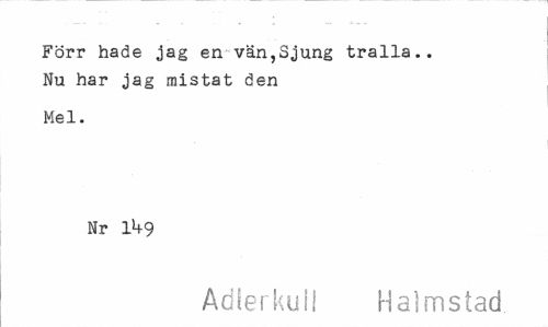 //// Förr hade jag en vän,Sjung tralla.. Nu har jag mistat den //// Mel. //// Nr IU9 //// Adlerkull Halmstad ////