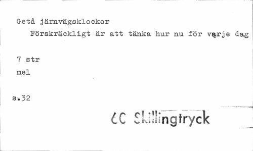 //// Getå järnvägsklockor //// Förskräckligt är att tänka hur nu för v^rje dag //// 7 str mel //// s.32 //// dC Skillingtryck ////