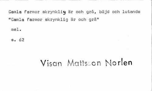 //// Gamla farmor skrynklig är och grå, böjd och lutande "Gamla farmor skrynklig är och grå" //// mel. //// s. 62 //// Visan Malls: cn Horlen ////
