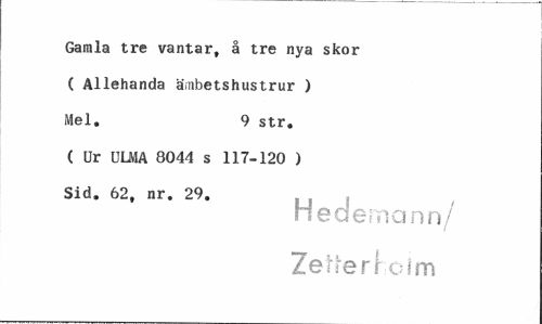 //// Gamla tre vantar, å tre nya skor ( Allehanda ämbetshustrur ) Mel. 9 str. //// ( Ur ULMA 8044 s 117-120 ) Sid. 62, nr. 29. //// H ederna nn/ Zetierf olm ////
