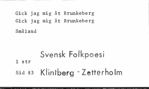 //// Gick jag mig åt Brunkeberg Gick jag mig åt Brunkeberg //// Småland //// Svensk Folkpoesi //// 1 str //// sid 83 Klinfberg "Zetterholm ////
