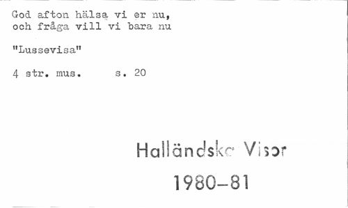 //// God afton hälsa vi er nu, och fråga vill vi bara nu //// "Lussevisa" //// 4 str. mus. s. 20 //// Halländske Visor 1980-81 ////