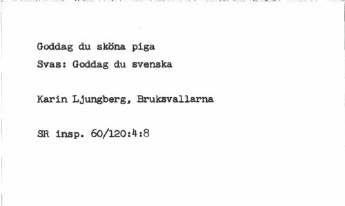 //// Goddag du sköna piga Svas: Goddag du svenska //// Karin Ljungberg, Bruksvallarna //// SR insp. 60/120:4:8 ////