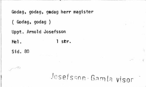 //// Godag, godag, gadag herr magister //// ( Godag, godag ) //// Uppt. Arnold Josefsson //// Mel. 1 sfcr. //// Sid. 80 //// Josefsson - Gamla visor ' ////