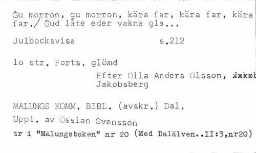 //// Gu morron, gu morron, kära far, kära far, kära far./ Gud låte eder vakna gla ... //// Julbocksvisa s.212 //// lo str. Forts, glömd //// Efter Olla Anders Olsson, äakia Jakobsberg //// MALUNGS KOMM. BIBL. (avskr.) Dal. Uppt. av Ossian Svensson //// tr i "Malungsboken" nr 20 (Med Dalälven. .11:3,nr20) ////