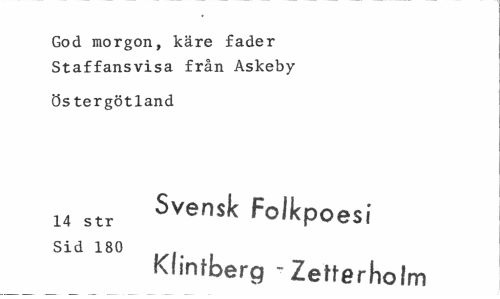 //// God morgon, käre fader Staffansvisa från Askeby //// Östergötland //// Svensk Folkpoesi //// 14 str r //// Sid 180 //// Klintberg - Zetterholm ////