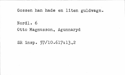//// Gossen han hade en liten guldvagn. Nordl. 6 //// Otto Magnusson, Agunnaryd SB insp. 57/10.617:13,2 ////