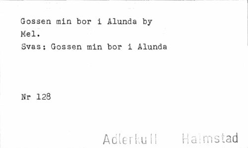 //// Gossen min bor i Ålunda by Mel. //// Svas: Gossen min bor i Alunda Nr 128 //// Adlerkull Halmstad ////