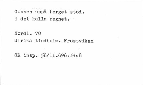 //// Gossen uppå berget stod. i det kalla regnet. //// Nordl. 70 //// Ulrika Lindholm. Frostviken SR insp. 53/11.696:1*+:8 ////