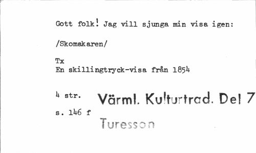 //// Gott folk! Jag vill sjunga min visa igen: //// /Skomakaren/ Tx //// En skillingtryck-visa från 1854 //// 'str" Värml. Kulturtrcd. De! 7 //// s. 1U6 f //// Turesson ////