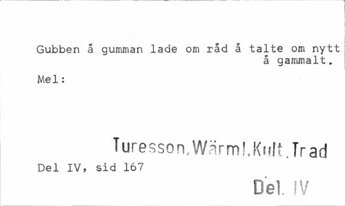 //// Gubben å gumman lade om råd å talte om nytt //// å gammalt. //// Mel: //// Turesson, Wärm 1, Kult. Träd //// Del IV, sid 167 //// Del IV ////