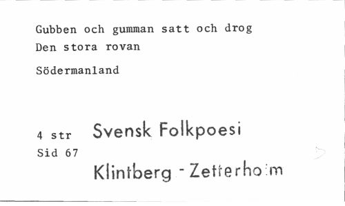 //// Gubben och gumman satt och drog Den stora rovan //// Södermanland //// 4 str Svensk Folkpoesi //// Sid 67 //// Klintberg - Zetrerho m ////