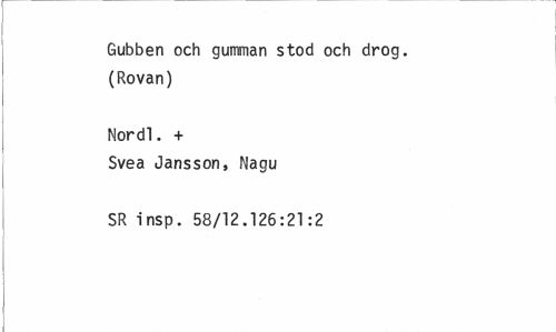 //// Gubben och gumman stod och drog. (Rovan) //// Nord!. + //// Svea Jansson, Nagu SR insp. 58/12.126:21:2 ////