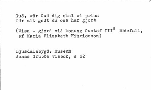 //// Gud, wår Gud dig skal wi prisa för alt godt du oss har gjort //// / s //// (Wisa - gjord vid konung Gustaf III dödsfall, //// af Maria Elisabeth Hinricsson) //// Ljusdalsbygd. Museum Jonas Grubbs visbok, s 22 ////