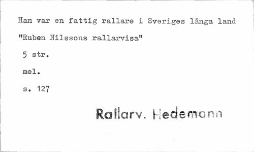 //// Han var en fattig rallare i Sveriges långa land "Ruben Nilssons rallarvisa" 5 str. mel. s. 127 //// Rödarv. Hedemcmn ////