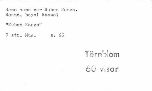 //// Hans namn var Ruben Hanzo. Ranzo, boysl Ranzo'. //// "Ruben Ranzo" //// 9 str. Mus. s. 66 //// Törno'om 60 visor ////