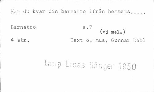 //// Har du kvar din barnatro ifrån hemmets... //// Barnatro s.7 //// (ej mel.) //// 4 str. Text o. mus. Gunnar Dahl //// Isp D -[ : - a ; ( r ¦ p r ' 0 c n i i - •• • iöjU ////