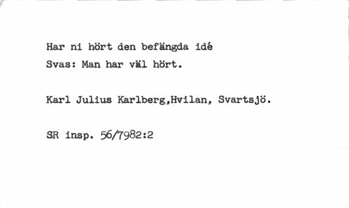 //// Har ni hört den befängda idé Svas: Man har väl hört. //// Karl Julius Karlberg,Hvilan, Svartsjö. //// SR insp. 56/7982:2 ////