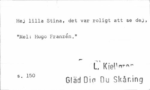 //// Hej lilla Stina, det var roligt att se dej, "Mel: Hugo Franzén." //// C Kiel^*- //// s 150 //// Gläd Din Du Skåning ////