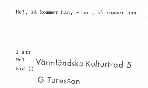 //// Hej, så kommer han, - hej, så kommer han 1 str //// Mel Värmländska Kulturtrad 5 //// Sid 22 //// G Turesson ___ ////