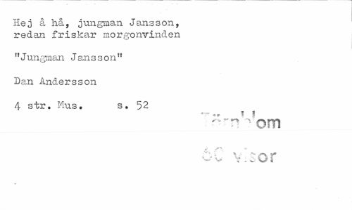 //// Hej å hå, jungman Jansson, redan friskar morgonvinden //// "Jungman Jansson" //// Dan Andersson //// 4 str. Mus. s. 52 //// T 'om //// w V _ i O f ////