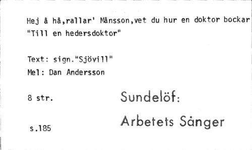 //// Hej å hå,rallar' Månsson,vet du hur en doktor bockar "Till en hedersdoktor" //// Text: sign."Sjövill" Mel: Dan Andersson //// 8 Str. Sundelöf: //// s 185 Arbetets Sånger ////