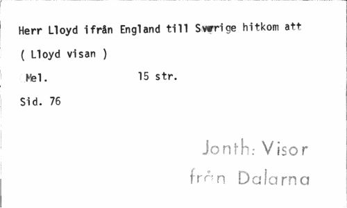 //// Herr Lloyd ifrån England till Svrrige hitkom att ( Lloyd visan ) Mel. 15 str. //// Sid. 76 //// Jonth: Visor frr-n Dalarna ////