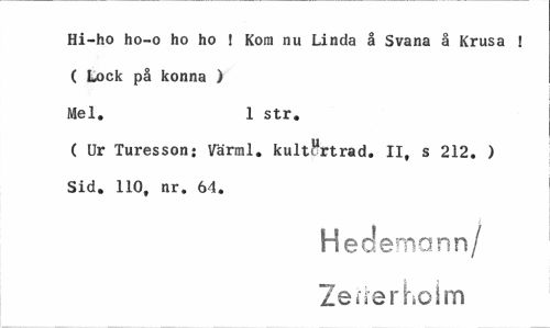 //// Hi-ho ho-o ho ho ! Kora nu Linda å Svana å Krusa ! //// ( Lock på konna ) //// Mel. 1 str. //// ( Ur Turesson: Värml. kultWrtrad. II, s 212. ) Sid. 110, nr. 64. //// H ederna nn/ Zerterholm ////