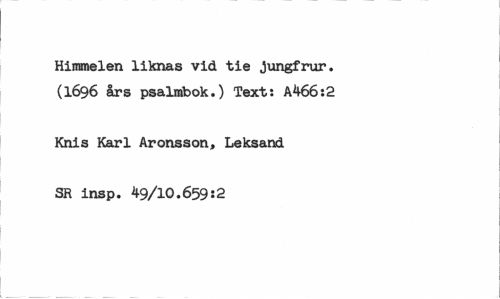 //// Himmelen liknas vid tie jungfrur. (1696 års psalmbok.) Text: å466:2 //// Knls Karl Aronsson, Leksand //// SR insp. 49/10.659!2 ////