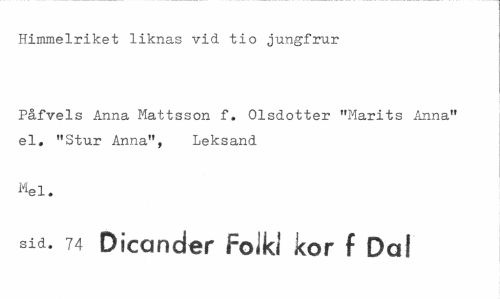 //// Himmelriket liknas vid tio jungfrur //// Påfvels Anna Mattsson f. Olsdotter "Marits Anna" el, "Stur Anna", Leksand //// Mel. //// ^d. 74 Diccinder Foiki kor f Dal ////