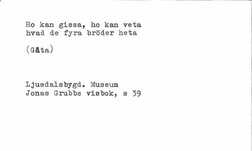//// Ho kan gissa, ho kan veta hvad de fyra bröder heta //// (Gåta) //// Ljusdalsbygd. Museum Jonas Grubbs visbok, s 39 ////