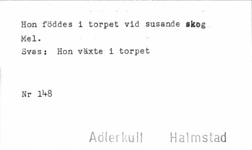 //// Hon föddes i torpet vid susande sk©g Mel. //// Svas: Hon växte i torpet Nr l*t8 //// Adlerkull Halmstad ////