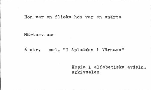 //// Hon var en flicka hon var en snärta Märta-visan //// 6 str. mel. "I Apladalen i Värnamo" //// Kopia i alfabetiska avdeln. arkivsalen ////