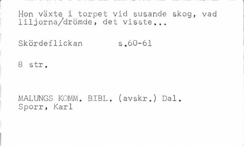 //// Hon växte i torpet vid susande skog, vad liljorna/drömde, det visste... //// Skördeflickan s. 60-61 //// 8 str. //// MALUNGS KOMM. BIBL. (avskr.) Dal. Sporr, Karl ////