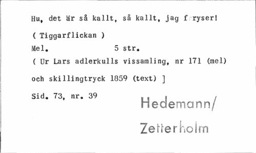 //// Hu, det är så kallt, så kallt, jag f ryser! //// ( Tiggarflickan ) //// Mel. 5 str. //// ( Ur Lars adlerkulls vissamling, nr 171 (mel) och skillingtryck 1859 (text) ] Sid. 73, nr. 39 i i I //// hedern cmn/ Zerrei Holm ////