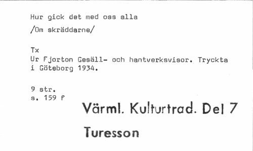 //// Hur gick det med oss alla /Om skräddarns/ //// Tx //// Ur Fjorton Gesäll- och hantverksvisor. Tryckta i Göteborg 1934. //// 9 str. //// Värml. KuJturtrad. Del 7 Turesson ////