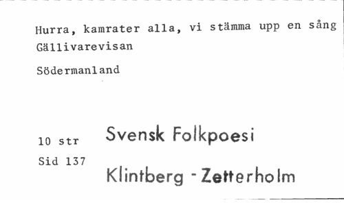 //// Hurra, kamrater alla, vi stämma upp en sång Gällivarevisan //// Södermanland //// 10 str Svensk Folkpoesi //// Sid 137 //// Klintberg "Zetterholm ////