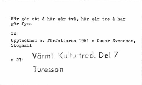 //// Här går ett å här går två, här går tre å här går fyra //// Tx //// Upptecknad av författaren 1961 e Oscar Svensson, Skoghall //// or? Värm!. Kjit^tracL Del 7 //// s 27 //// Turesson ////