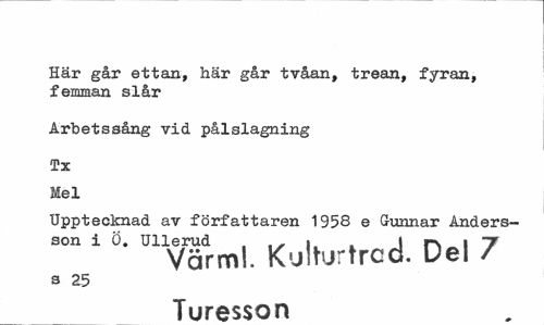 //// Här går ettan, här går tvåan, trean, fyran, femman slår //// Arbetssång vid pålslagning //// Tx //// Mel //// Upptecknad av författaren 1958 e Gunnar Anders- //// U11vårmi. KulturtrocL Del 7 //// s 25 //// Turesson ////